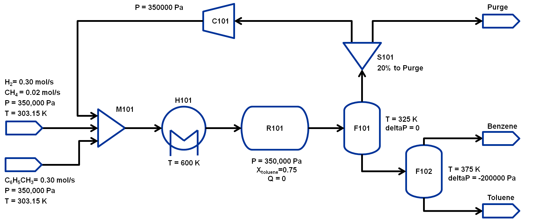The flowsheet that we will be using for this module is shown below with the stream conditions. We will be processing toluene and hydrogen to produce at least 370 TPY of benzene. As shown in the flowsheet, there are two flash tanks, F101 to separate out the non-condensibles and F102 to further separate the benzene-toluene mixture to improve the benzene purity. Note that typically a distillation column is required to obtain high purity benzene but that is beyond the scope of this workshop. The non-condensibles separated out in F101 will be partially recycled back to M101 and the rest will be either purged or combusted for power generation.We will assume ideal gas for this flowsheet. The properties required for this module are available in the same directory: